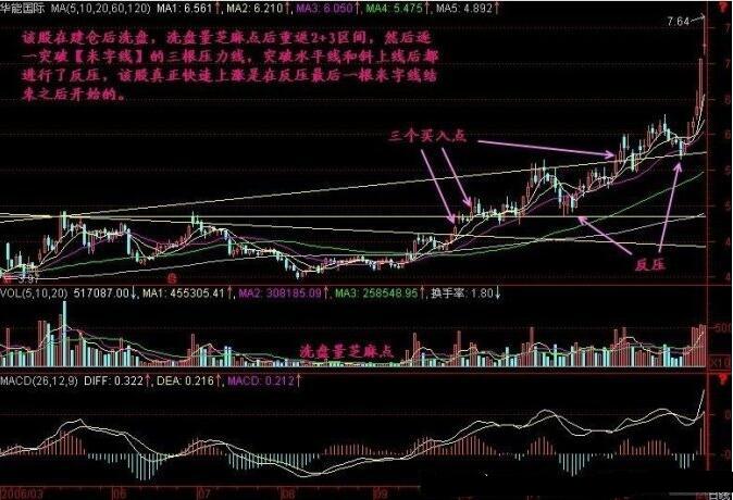同理可以分析,華能國際從2006年2月到8月的股價(jià)走勢,在建倉洗盤后,量能較小,此時(shí)形成的米字線形態(tài),需要投資者注意其中的三根壓力線與股價(jià)的變化,突破水平線,和斜向上線后都進(jìn)行了反壓,在突破壓力之后,才會(huì)出現(xiàn)真正的上漲,其中,最后一根線突破之后的上漲幅度是最大的,希望投資者能夠把握其中的買入點(diǎn)位置。