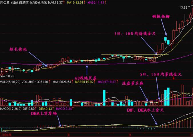 如圖同仁堂在2004年8月到9月的日K線股價走勢,經(jīng)過長達一個月的橫盤走勢,股價出現(xiàn)了短長價托的走勢形態(tài),在向上突破的時候,5日均線與10日均線形成了金叉走勢,同時對應的均量線也形成了金叉形態(tài),但是量能卻是很小的洗盤量芝麻,結(jié)合macd指標進行分析,dea向上上穿0軸,兩線在0軸上方形成了水上金叉的形態(tài),此時形成了三金叉見底的走勢形態(tài),投資者可以在形成進行的位置進行買入操作,等待后市的上漲變化。