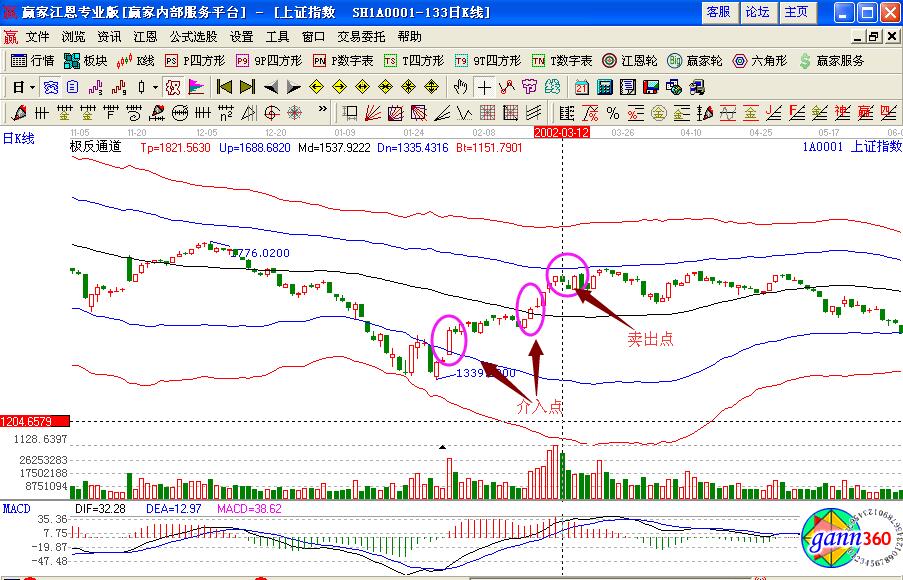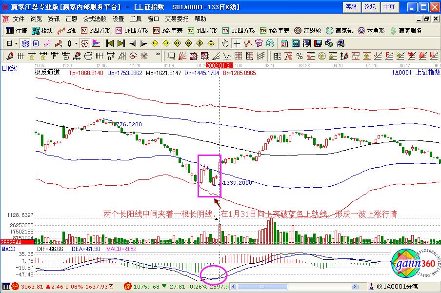 通過江恩軟件進(jìn)行分析,發(fā)現(xiàn)在1月28日的時(shí)候,K線形成的是兩個(gè)長陽線中間夾著一些小陽線和一根長陰線,并且在1月31日的時(shí)候,向上突破藍(lán)色上軌線,預(yù)示著一波上漲的走勢行情,再加上此時(shí)macd指標(biāo)形成的是金叉買入的操作信號,投資者可以積極的金叉買入操作。