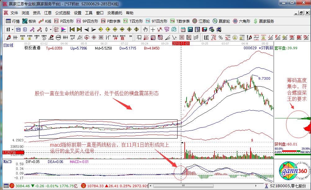 如圖000629的個股走勢形態(tài),在2010年到2011年初的整體運(yùn)行走勢,股價一直處于生命線的附近運(yùn)行,并且是在低位進(jìn)行的橫盤整理形態(tài),量能也沒有太大的變化,但是在股價進(jìn)入10年11月初運(yùn)行的時候,股價向上拉升在生命線上方運(yùn)行,量能有所變化,macd指標(biāo)兩線形成的了金叉買入的操作信號,該股的籌碼形態(tài)比較集中,符合螺旋槳王的K線形態(tài),大膽的投資者可以進(jìn)行操作。