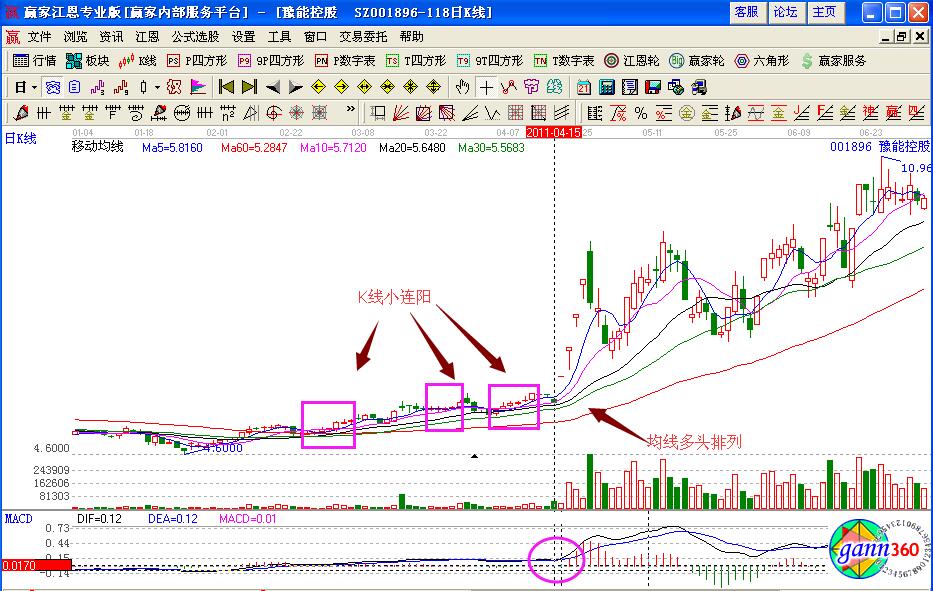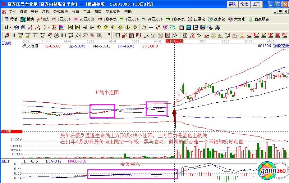 豫能控股是一個(gè)典型的K線小連陽的個(gè)股走勢(shì),如圖001896在2011年3月到4月的股價(jià)走勢(shì)K線變化,前期股價(jià)一直處于生命線的附近,不斷的拉升連續(xù)的小陽K線,是主力在低位吸貨的表現(xiàn),同時(shí)連續(xù)的K線小連陽預(yù)示著股價(jià)上漲的操作信號(hào),其中在2011年4月20日的時(shí)候,股價(jià)向上突破藍(lán)色上軌線,形成一字漲停板,macd形成金叉買入信號(hào),第二天的量能急劇放大,是一個(gè)黑馬啟動(dòng)的點(diǎn)位,投資者要積極的做好介入準(zhǔn)備。