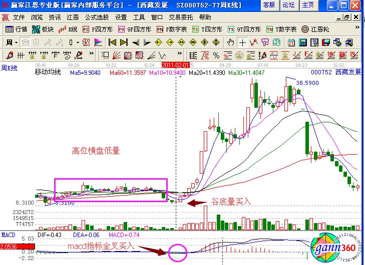 西藏發(fā)展(000752)在2011年初的股價走勢,前期經歷了一波高位橫盤的地量走勢,是一個賣出的信號,如果沒有賣出,可以繼續(xù)觀察后期的走勢,在2月1日的時候形成了谷底地量的形態(tài),對應的成交量是低量,并且形成的是十字星的變盤信號,macd指標形成的是金叉買入的信號,投資者可以積極的進行買入操作。