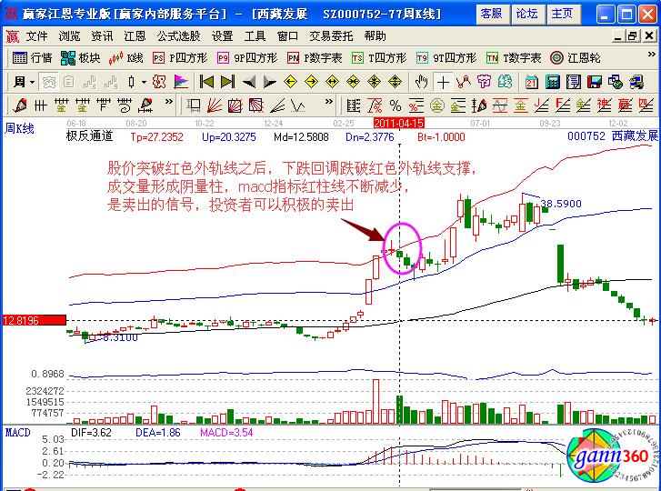 在投資者介入之后,必然要了解賣出獲利的點的,同樣是在極反通道中,該股向上連續(xù)拉升了多個交易日,以漲停大陽線突破藍色上軌線,紅色外軌線,在高位橫盤兩天,第三天形成了下跌陰線跌破紅色外軌線,是一個下跌賣出的信號,同時對比macd指標的走勢,其紅柱線不斷的減少預示著短期下跌的信號,可以積極的選擇賣出獲利。
