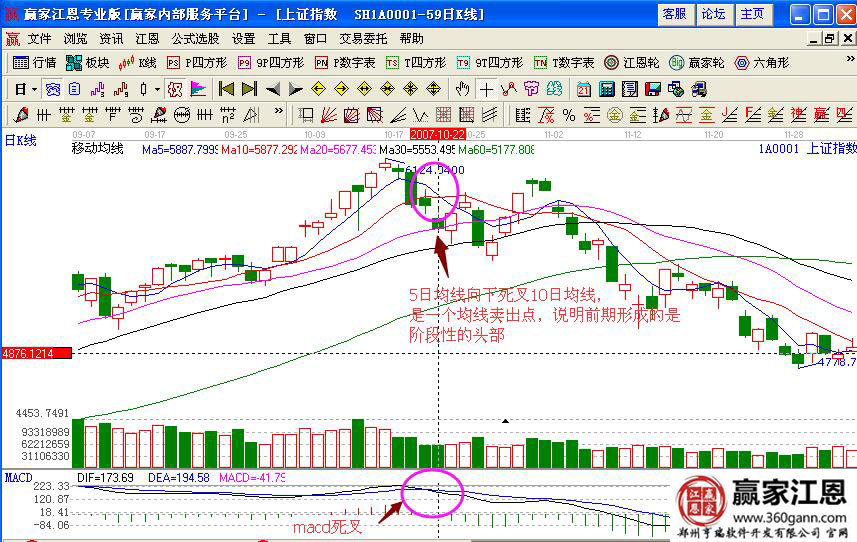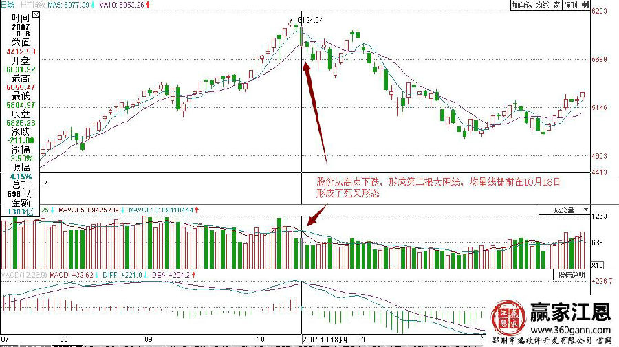 如圖上證指數(shù)在2007年10月份的走勢變化,指數(shù)經(jīng)過上漲拉升到達6124.04的高點之后,開始下跌回落,此時5日均線下穿10日均線形成了高位的一個死叉,是賣出的信號,說明前期的走勢已經(jīng)形成了一個階段的高點;