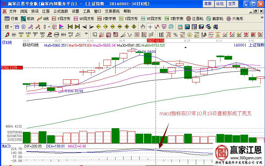 重要的是macd指標買賣點的確認情況,分析上漲指數(shù)在2007年10月19日的走勢變化,指數(shù)在下跌的第三天,均線拐頭向下,macd指標形成了死叉的賣出信號,這個時候投資者應該已經(jīng)是選擇賣出了。這個時候發(fā)現(xiàn),均線死叉、均量線死叉、macd指標死叉是連續(xù)的出現(xiàn),說明前期的走勢形成的是一個短期的頭部形態(tài),希望投資者把握其中的盈利機會。
