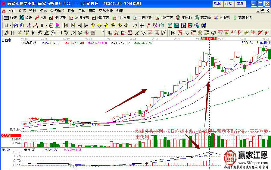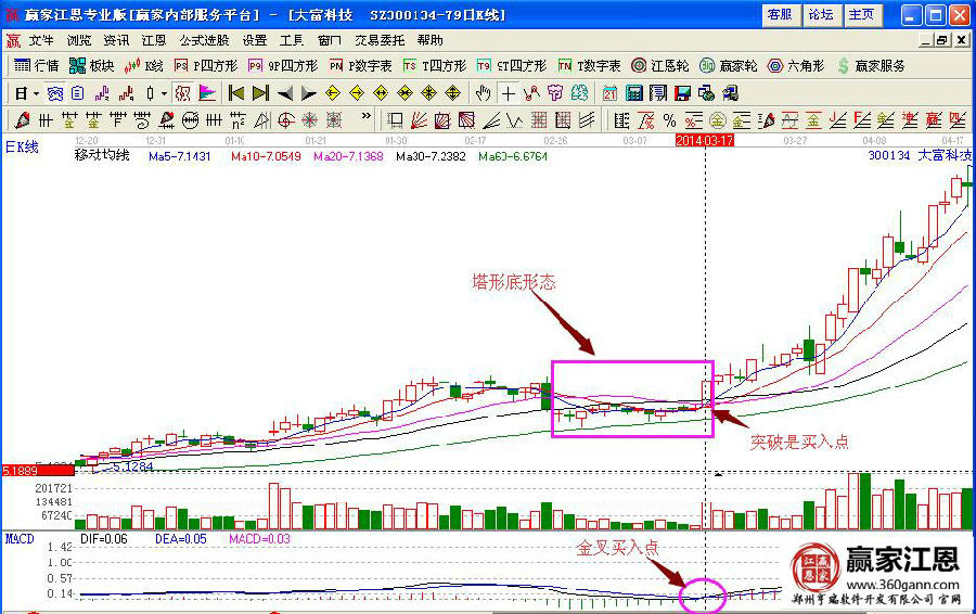 如圖大富科技(300134)在2013年底到2014年初的股價走勢形態(tài),在均線的簡單走勢配合中,前期的股價走勢是一直在低位橫盤整理的蓄勢形態(tài),雖然有緩慢的拉升,但是上漲的幅度不是很大,之后股價在14年3月份的時候形成了塔形底的形態(tài),在3月17日形成一根大陽線向上突破,對應的成交量明顯的放大,說明有資金入場,macd指標形成金叉買入的操作信號,均線多頭排列預示著上漲的操作行情,投資者可以積極的介入。