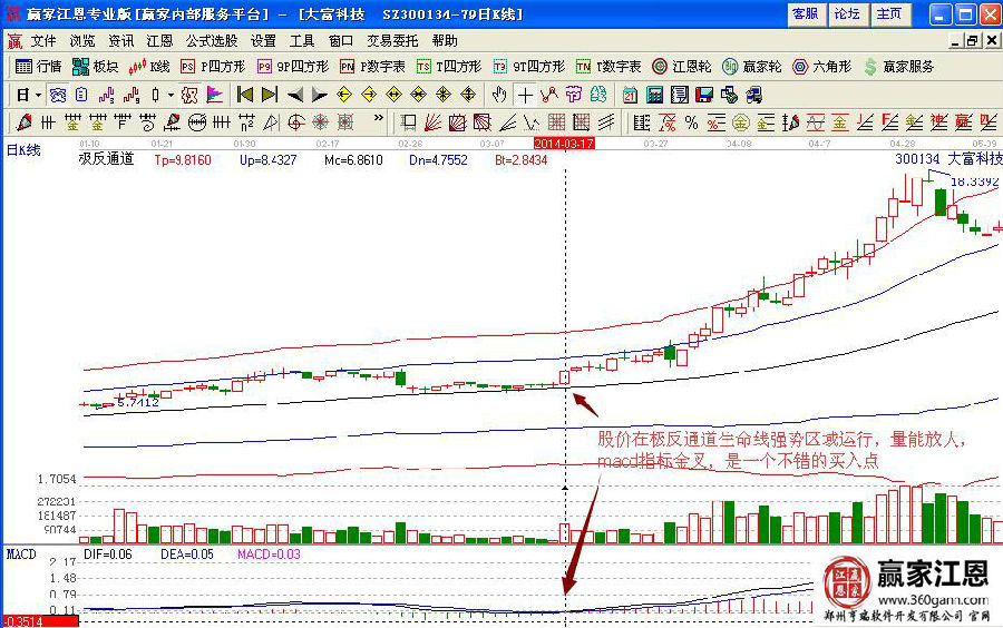 如果投資者不放心買點的位置,可以通過贏家江恩的極反通道進行研判,如圖在14年3月17日的時候,股價以漲停陽線站穩(wěn)生命線并向上拉升,在強勢區(qū)域中運行,量能不斷的放大,macd指標金叉,是一個不錯的買入點位置。