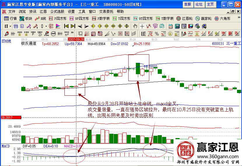其實(shí)仔細(xì)分析該股的走勢可以發(fā)現(xiàn)在極反通道中,該股從9月28日站上生命線,同時macd指標(biāo)形成金叉,成交量倍量柱,是介入的操作信號,之后股價一直在生命線上方的強(qiáng)勢區(qū)域運(yùn)行,最終在10月25日沒有向上突破藍(lán)色上軌線的壓力,出現(xiàn)了長陰夾星的走勢,預(yù)示著下跌的走勢行情,投資者可以及時的賣出獲利,以規(guī)避下跌中的資金損失。