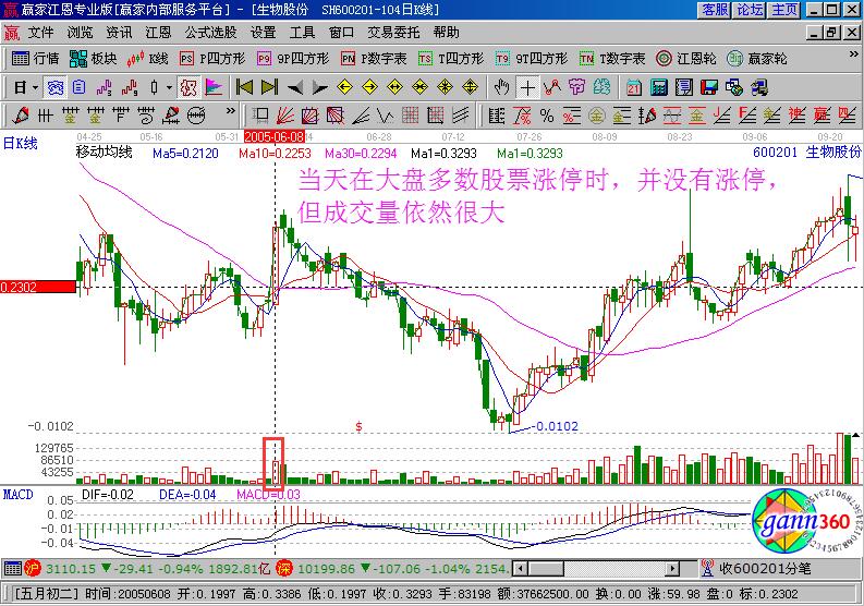 在2005年6月8日大盤漲勢猛烈,上證指數(shù)漲幅是8.2%,大盤中有很多漲停個股,有些個股雖然沒有漲停,但成交量也很大,生物股份(600201)就是其中一個。該股當(dāng)天成交317萬股,成交量已經(jīng)相當(dāng)高,感覺就像是隨大盤上漲帶來大量追漲盤,但提醒大家需要注意的是:當(dāng)日間斷性交易。