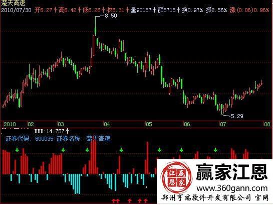 是利用紅綠柱線進行表示的,其中股價上漲中,紅柱線偏多,具體的走勢案例如圖楚天高速在2010年7月30日的股價走勢,在8.50元的高點見頂,5.29元見底,投資者可以從中把握操作的機會。