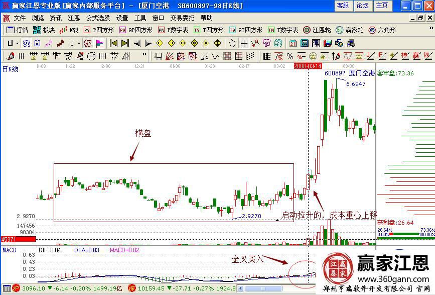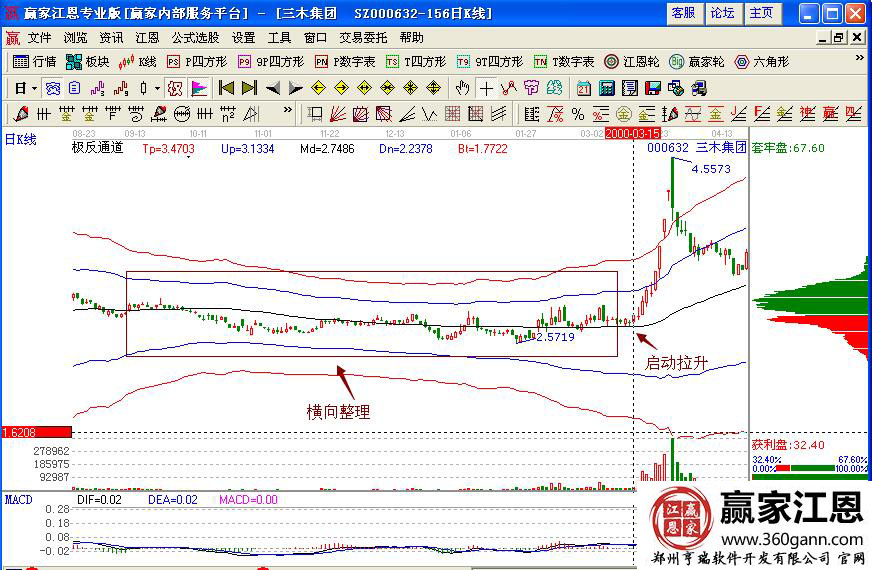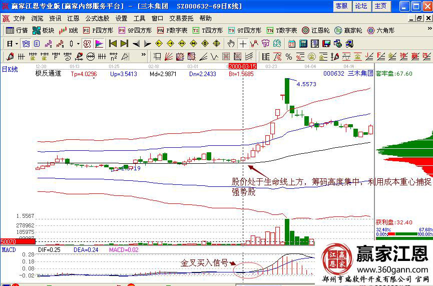 然而三木集團(tuán)逐漸隨著大盤的回升而上升,從2000年3月15日向上突破整理平臺(tái),開始向上拉升,對(duì)應(yīng)的量能放大,macd指標(biāo)形成金叉,關(guān)鍵是股價(jià)處于極反通道生命線上方,籌碼高度集中,是上漲的行情預(yù)測(cè),投資者可以利用成本重心捕捉強(qiáng)勢(shì)股的走勢(shì),當(dāng)后期股價(jià)跌破支撐線下跌的時(shí)候,再及時(shí)的賣出獲利。
