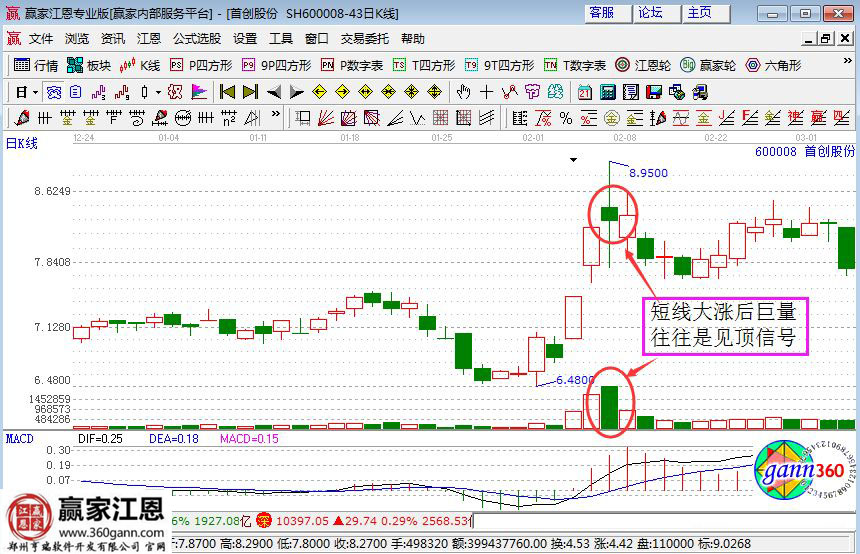 相對于正常成交量放大倍數(shù)很大的個股,成交額越大后市越難以上漲,短線見頂信號越明顯。