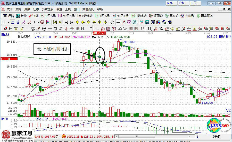 在2015年12月8日的時候,該股走出了一根長上影的假陰線(如下圖),當(dāng)時自己看到這種走勢就會以為是拉高趕人的走勢,就會非常感興趣,第二天很想短線介入,但是通過研判之前的銀輪長上影所以選擇放棄,因為前面每次伴隨著長上影的總是下跌。