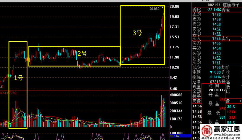 下圖是三泰控股在2014年的部分歷史走勢,為了方便大家的理解,小編將其劃分為了三個(gè)區(qū)域,這三個(gè)區(qū)域是非常明顯的,如下圖所示。圖中的1號區(qū)域及時(shí)集中放量的區(qū)域,這個(gè)位置就是主力高位建倉的位置,建倉后,一直在放量價(jià)格以上。