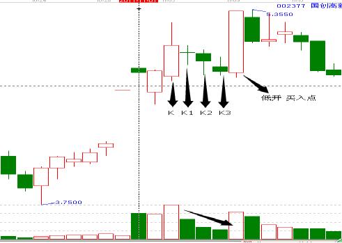 在股票形態(tài)中直升機(jī)空中加油戰(zhàn)法和陽包陰想綜合話就形成了三只喜鵲鬧枝頭短線戰(zhàn)法。該股的具體圖形如下圖。當(dāng)這種形態(tài)出現(xiàn)在一波上漲的初始階段或者中途階段,是對之前上漲趨勢的延伸。這種出現(xiàn)后,第二天通常低開的機(jī)會就是買點(diǎn),記住,第二天低開的點(diǎn)位基本上會在K3的最低點(diǎn)處。所以買點(diǎn)很好把握,關(guān)鍵是看你有膽量如何。因?yàn)榈诙斓牡烷_就是第四個(gè)陰線了。