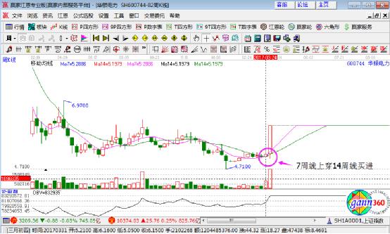 1、 均線運(yùn)行:K線圖上,當(dāng)7周均線上穿14周均線時,堅(jiān)決買進(jìn)(如下圖);反之,當(dāng)7周均線下穿14周均線時,就果斷賣出。