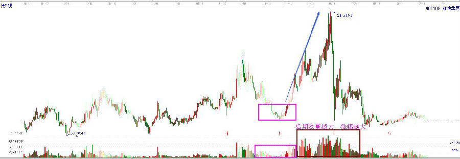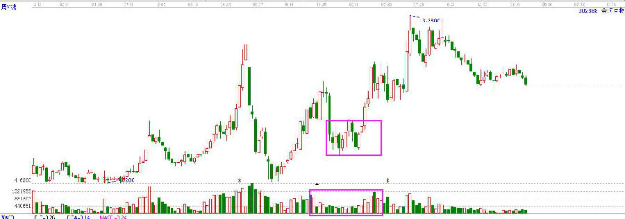 這里還有一點(diǎn)需要我們注意,如果一支股票股價(jià)下跌的幅度越來(lái)越小,或者是直接出現(xiàn)跳空下跌的缺口,成家量也伴隨著大幅的縮小,然后又出現(xiàn)放量股價(jià)拉升的情況,那就是市場(chǎng)見(jiàn)底的表現(xiàn)。其實(shí)在成交量見(jiàn)底的時(shí)候,也代表著投資者對(duì)于該股票的期待情緒降到最低的時(shí)候,在下跌的過(guò)程中,賺錢該走的都走了,虧損的也套死不愿意動(dòng)了,市場(chǎng)的交易已經(jīng)變的很清淡,按照中國(guó)易經(jīng)里講的,物極必反:全則必缺、極則必反,下跌至一定的程度之后,必定要向相反的方向運(yùn)行,底部形成,就是放心大膽的買進(jìn),然后耐心等待市場(chǎng)反轉(zhuǎn)拉升。