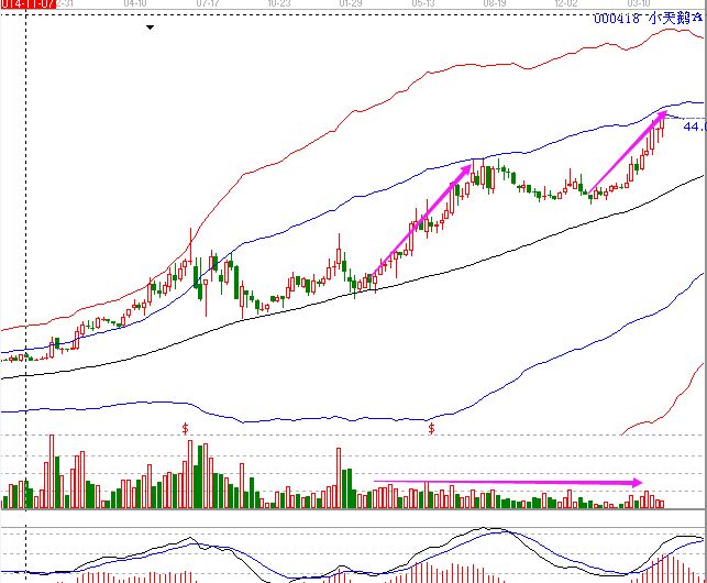 上漲無量是股票比較強勢的走勢,到極致就是無量漲停。無量上漲是成交量少,沒有此票的人很那買到。而有這票的人就只需等待上漲即可,這些股票一般出現(xiàn)在莊家對于股票高控的時候,少量的成交量就能夠帶來股價的上漲,最近的小天鵝A的走勢就是如此,我們從周線上可以明顯的看出來。