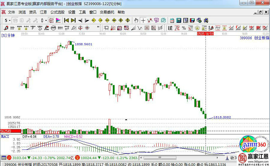 看完了籌碼上的分析之后,我們在看創(chuàng)業(yè)板的5分鐘走勢圖。下圖中最強紅色路線,開盤直接上攻,拿下1833不拖泥帶水,回踩不破1814,此后具備線段反彈上攻的能力,上面壓力位是1840。