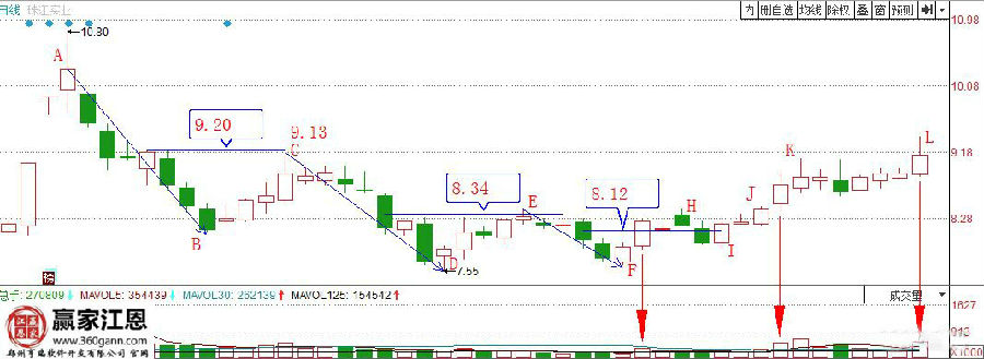 同樣的,從E柱到F柱,跌幅不足10個點,那就必須要按照31位來進(jìn)行計算了,因此F柱體之后的止跌反彈那,高度應(yīng)該在8.12元左右,從它后來真正的陽實頂,則是8.22元站在了31位之上,顯然是非常典型的凹間峰的走勢。