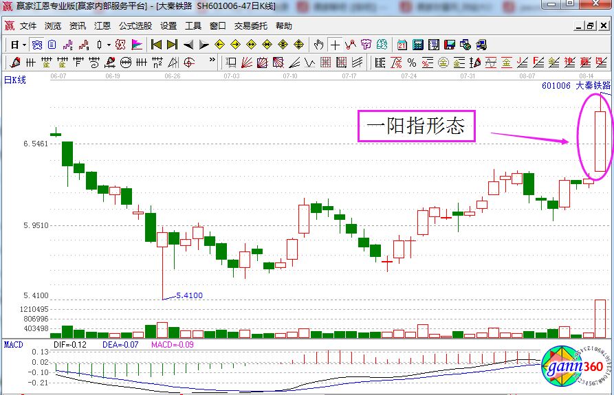 上圖是中南重工在2013年8月份的走勢(shì)圖,該股前期在經(jīng)過(guò)一波下跌之后,在低位形成了緩慢爬升的個(gè)股,圖中該股在8月8日股價(jià)放量拉升,而且成交量相比前幾日明顯的放大,這樣就是形成了比較典型的一陽(yáng)指形態(tài)。所以在當(dāng)天尾盤(pán)股價(jià)放量上攻漲勢(shì)確立后果斷的以7.46元的價(jià)位進(jìn)行買(mǎi)入,在次日以4.59元的價(jià)位賣(mài)出,盈利1.56%。