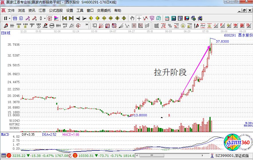 我們知道莊家在拉升的階段,成交量一般會呈現(xiàn)大幅的放大,當(dāng)然這也就是平常我們所說的量價齊升,呈現(xiàn)的是逐步遞增的走勢,能量上是逐步得到了聚焦,所以相對來說市場是活躍的。當(dāng)然在日K線上的表現(xiàn),那么就是股價節(jié)節(jié)拔高,走勢好像是破土的竹子。如下面的西水股份就處在拉升的階段之中。