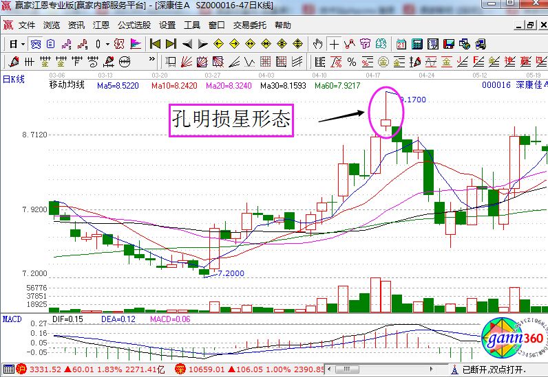孔明損星形態(tài)是怎么樣的?如果從字面上理解的話,這個(gè)詞是用來(lái)形容輝煌過(guò)后的形式,如果是在股票中,那肯定也是上漲末期所出現(xiàn)的形態(tài)。從K線上看的話,它其實(shí)就是一根跳空向上的弓形線,而且基本上在該形態(tài)之后的第二天就收出實(shí)體比較長(zhǎng)的陰線,如下面的深康佳A的走勢(shì)圖。