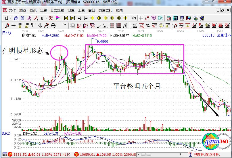 深康佳A在出現(xiàn)孔明損星形態(tài)之后,股價(jià)先死下跌,而后反彈原來(lái)的股價(jià)區(qū)域,然后開(kāi)始了調(diào)整階段,而且調(diào)整的時(shí)間上大五個(gè)月之久,可見(jiàn)在這個(gè)區(qū)域中股價(jià)受到的阻力是非常大的。之后股價(jià)突破平臺(tái)整理向下開(kāi)啟了下跌的行情,顯然在整理期間持股,是最為不明智的選擇,如下圖所示。