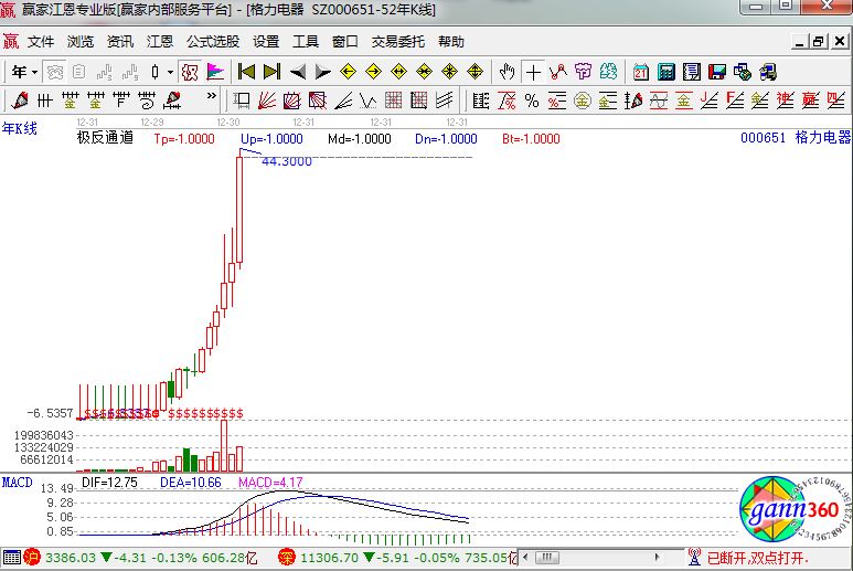 如上圖是該股的年線圖,從2005年開始到2016年,近11年的時(shí)間,格力電器每年的凈利潤(rùn),都是呈現(xiàn)處比較穩(wěn)定的正增長(zhǎng)。表現(xiàn)在股價(jià)的反應(yīng),就是股價(jià)逐年的增長(zhǎng),近端四件該股的走勢(shì)也進(jìn)入到了高潮期。
