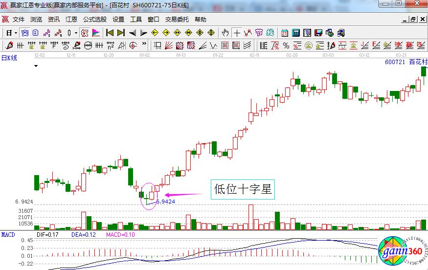 對于十字星的形態(tài),大家已經(jīng)了解果很多了,一般這個形態(tài)是出現(xiàn)在下跌趨勢中,出現(xiàn)上影線和下影線均比較長的K線,它的形態(tài)就好像是一顆十字星,這就是典型的低位十字星。如下圖所示。