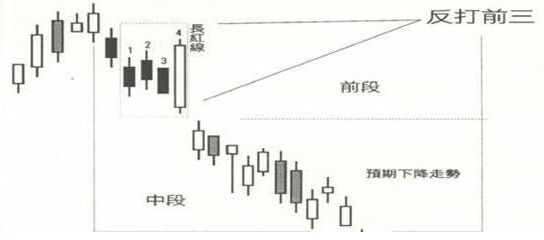 什么是初跌反打?它其實(shí)指的是:在下跌波的前段中,出現(xiàn)了一根長(zhǎng)紅線,可以包含之前的三只K線,這基本上就是多頭逃命的機(jī)會(huì),所以有人把它稱之為了救命稻草。如下圖所示。