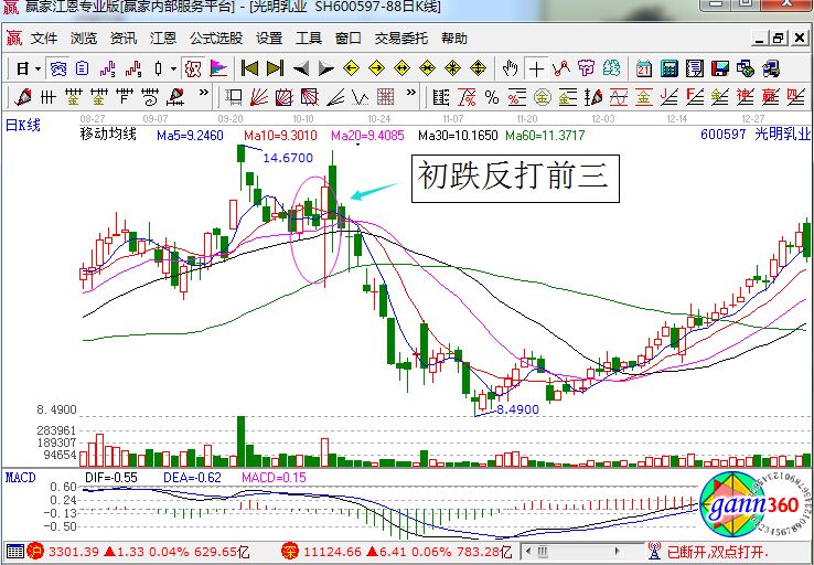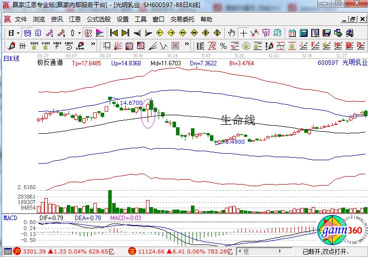 上面是光明乳業(yè)的在2007年10月份的走勢(shì),股價(jià)在上漲的高位出現(xiàn)了一個(gè)具有長(zhǎng)下影線的長(zhǎng)陽線,其中它包絡(luò)了前面三個(gè)交易日的K線走勢(shì),形成了典型的初跌反打前三的走勢(shì)形態(tài)。同時(shí)我們看均線上的走勢(shì),它已經(jīng)走出了拐頭向下的趨勢(shì),成交量的量能逐漸的縮小,同時(shí)macd指標(biāo)形成了死叉的賣出信號(hào),顯然投資者應(yīng)該及時(shí)把握賣出的機(jī)會(huì)。我們調(diào)出極反通道來進(jìn)一步的分析股價(jià)所處的位置。