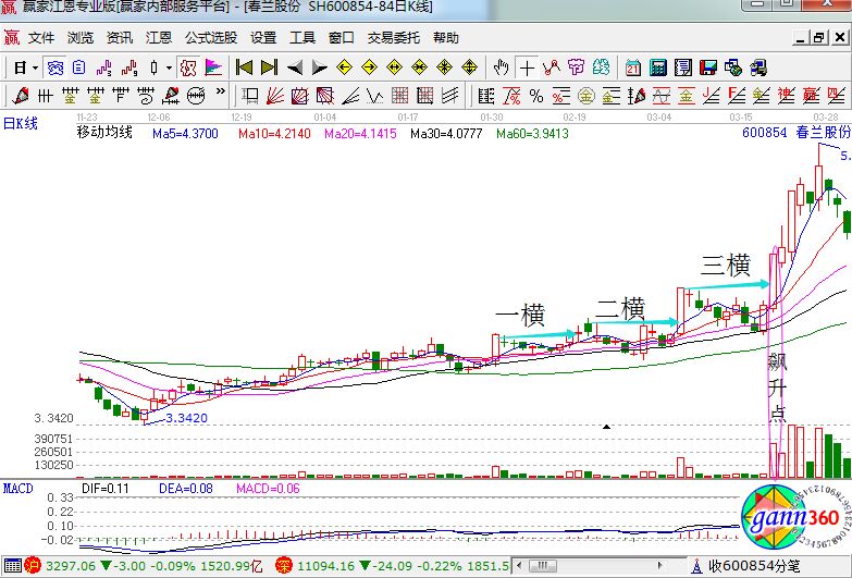 春蘭股份在2012年12月份的走勢(shì)中,我們可以看到,該股在27日站上了60日中期均線(xiàn),它是屬于可以操作的范圍。該股在2013年1月30日出現(xiàn)了大陽(yáng)線(xiàn),在隨后小K線(xiàn)縮量盤(pán)整,盤(pán)后繼續(xù)出現(xiàn)了二橫三橫,在三橫經(jīng)歷了8根K線(xiàn)后爆發(fā),走出了幾十點(diǎn)的行情,這里需要注意的是: