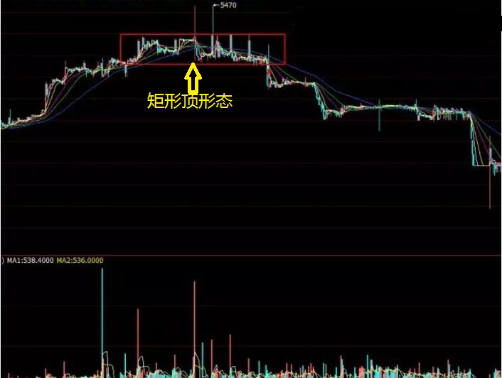 矩形頂形態(tài)是怎么樣子的?它其實指的就以在一個頭部區(qū)域走出了一個箱體走勢,在這個區(qū)域內(nèi)K線頂部有阻擋,下端有支撐,在價格上大致維持了一個箱體震蕩的格局。如下圖所示。