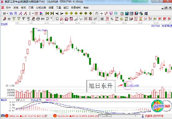 上圖是光華科技在2016年1月份的走勢圖,圖中我們可以看到該股在1月28日和29日形成了典型的旭日東升信號,我們在觀察該形態(tài)的話,它是在經(jīng)過了大幅度的連續(xù)下跌之后,在底部出現(xiàn)的,在出現(xiàn)該形態(tài)之后,股價開始進行上漲,顯然是一種非常符合標準的見底回升形態(tài)。