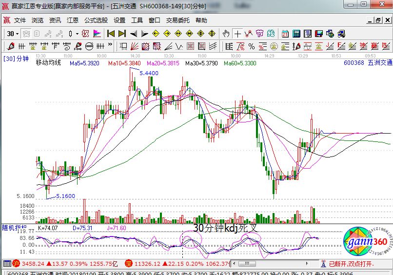 ④從技術(shù)面上分析的話,當(dāng)天不能漲停,或者30分鐘和60分鐘的kdj在高位形成死叉(如下面的五洲交通走勢圖),投資者都應(yīng)該進行清倉出局了。