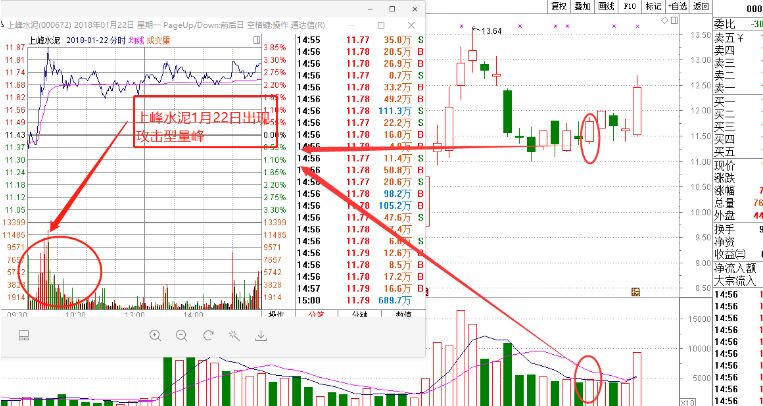 我們以上峰水泥的走勢圖來進行介紹,該股在縮量整理過程中,1月22日雖然是縮量狀態(tài),再度當天分時結構中出現(xiàn)了非常標準的攻擊型量峰,這其實就是為后面的大陽線埋下伏筆。