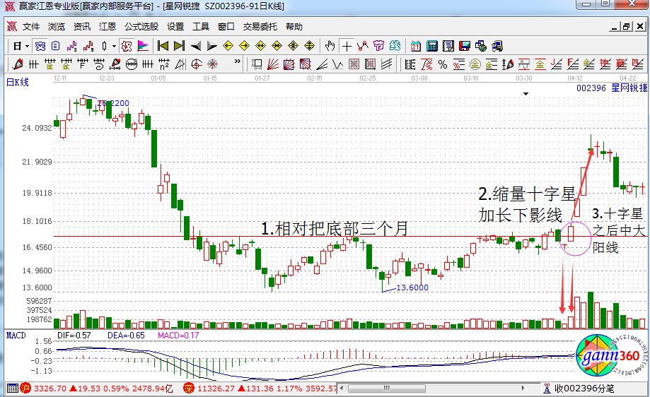 ?、苁中谴稳帐粘鲋写箨柧€,而且量能達(dá)十字星當(dāng)日兩倍以上,只有這樣機(jī)構(gòu)才能最終取得多頭啟動(dòng)拉升權(quán)。