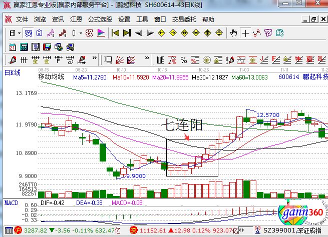 上圖是鵬起科技在2011年8月到11月份的走勢,圖中就非常走出了典型的七連陽形態(tài),當(dāng)然該形態(tài)是處在階段性的底部,如果我們分析當(dāng)時的情況的胡啊,可以發(fā)現(xiàn):