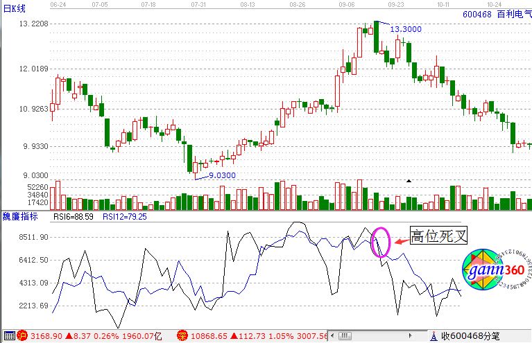 上面是百利電氣的走勢圖,從圖中我們可以看到,該股股價(jià)在經(jīng)過一波上漲后,在2013年9月13日的時(shí)候RSI指標(biāo)在高位形成了死叉形成,這就說明了股價(jià)已經(jīng)有了加速下跌的跡象,未來股價(jià)就會繼續(xù)下行。