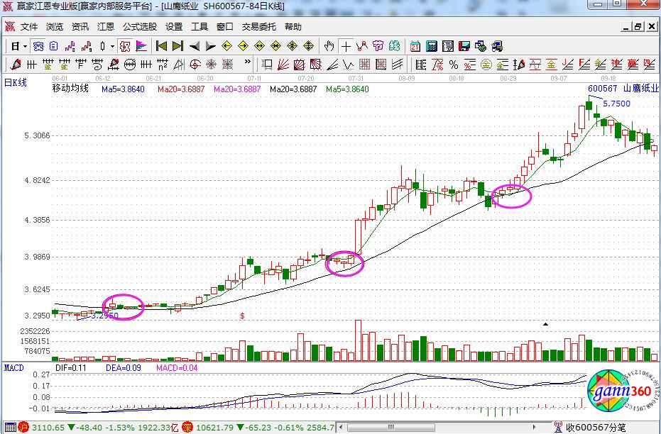 在了解過注意事項(xiàng)之后,那么怎么樣運(yùn)用均線捕捉波段機(jī)會(huì)?在波段應(yīng)用中,20日均線相對(duì)來說是一根中期均線,比較適合作為波段參照,這根均線一旦確立方向,波段指引方向就會(huì)比較明確。而5日均線又比較靈敏,利于作為買點(diǎn)參考,所以兩者配合很有效。如下面的山鷹紙業(yè)走勢(shì)圖。