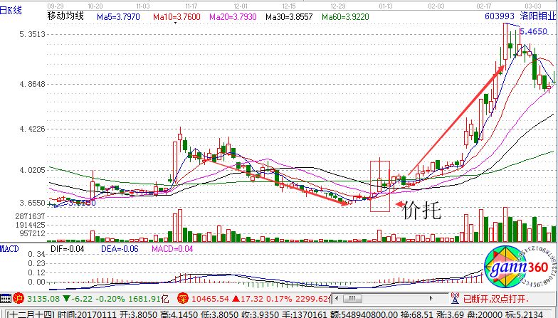 運用價托進(jìn)行抄底的技術(shù)要點,主要有三點,即①5線上穿10線,5線上穿20線,10線上穿20線,形成三角形;②三角形托著陽線,伴隨著成交量放量;③價托形成后,均線呈現(xiàn)多頭排列。