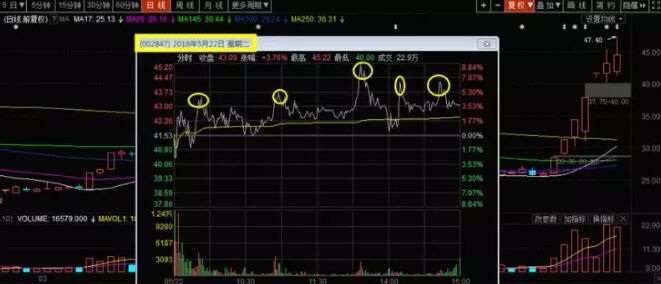 D點(diǎn)介入之后的賣點(diǎn)在哪里呢?我們繼續(xù)看圖,編號G的那筆陽線大家看出什么端倪了嗎?也就是2018年5月22日,收了一根上下影線均較長的K線,不得不使我們要懷疑主力的企圖。再來看那一天的分時圖。