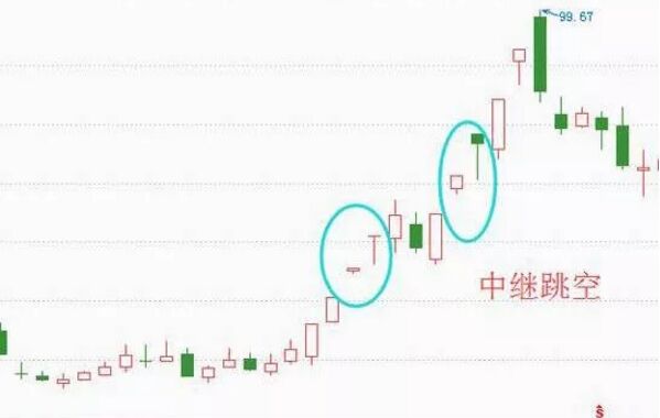 用股票軟件打開K線圖研究中繼跳空,就會(huì)發(fā)現(xiàn)中繼跳空通常是發(fā)生在新的市場(chǎng)趨勢(shì)、發(fā)展果一段時(shí)間之后,大約在整個(gè)趨勢(shì)的中間階段。價(jià)格跳躍前進(jìn),形成一個(gè)個(gè)跳空,這陽(yáng)的走勢(shì)就是中繼跳空。它的技術(shù)特征為:在趨勢(shì)中間階段發(fā)生,成交量表現(xiàn)一般是處于不大不小的狀態(tài)。相應(yīng)的圖形如下。