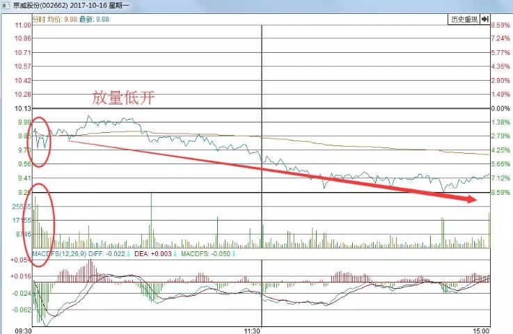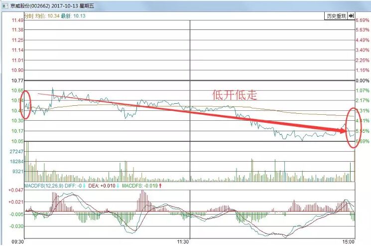 在2017年10月13日出現(xiàn)了低開低走的分時走勢,此時就要開始特別謹(jǐn)慎,如下圖。