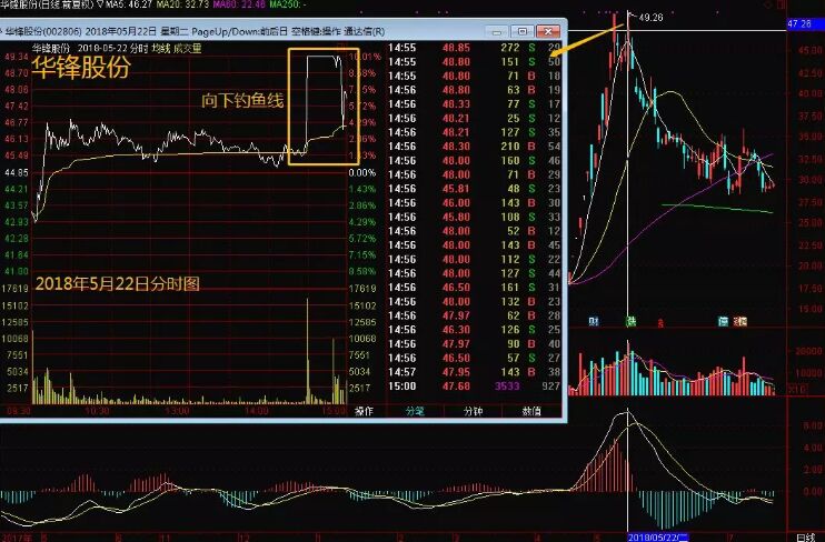 釣魚線形態(tài)分為向上釣魚線和向下釣魚線這兩大類。向上釣魚線,其實指的就是因消息面影響或投資過渡引發(fā)連續(xù)下跌,莊家因急于出貨,往往會選擇在傳統(tǒng)技術(shù)支撐點位做對敲拉升,吸引散戶跟風(fēng)。當(dāng)有足夠多的跟風(fēng)盤后,減少買盤,維護分時上漲的角度,繼續(xù)吸引人氣,待盤口人氣激活后就開始大量出貨,如下面的華鋒股份走勢圖。