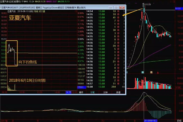 向下釣魚線,它指的就是因為連續(xù)上漲,股價已到達莊家目標(biāo)位置而且莊家已經(jīng)獲利豐厚,同時由于連續(xù)上漲,市場人氣相當(dāng)亢奮,積聚了大量的跟風(fēng)盤,而且莊家認(rèn)為大盤行情即將結(jié)束,來不及做高位區(qū)間出貨,此時莊家樂意選擇該種手法出貨,如下面的亞夏汽車走勢圖。