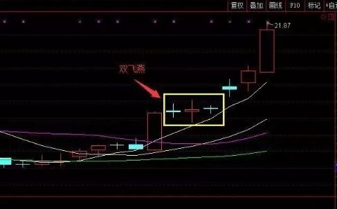 “雙飛燕”形態(tài)是一種K線技術(shù)形狀,走勢上出現(xiàn)大陽之后兩根并排上揚(yáng)成交量和振幅逐步遞減的十字星,而且均線系統(tǒng)通常是以完美的多頭排列列示,股價沿著10日均線強(qiáng)勁攀升。當(dāng)“雙飛燕”形態(tài)形態(tài)出現(xiàn)之后,股價一般大概率上是上行的,從這個意義上來說,該形態(tài)還有這推測頂部的功能,要注意該形態(tài)的位置,位置低,期望值就可大些,如果位置高,期望值就要小些,而且隨時準(zhǔn)備清倉離場。如下圖所示。