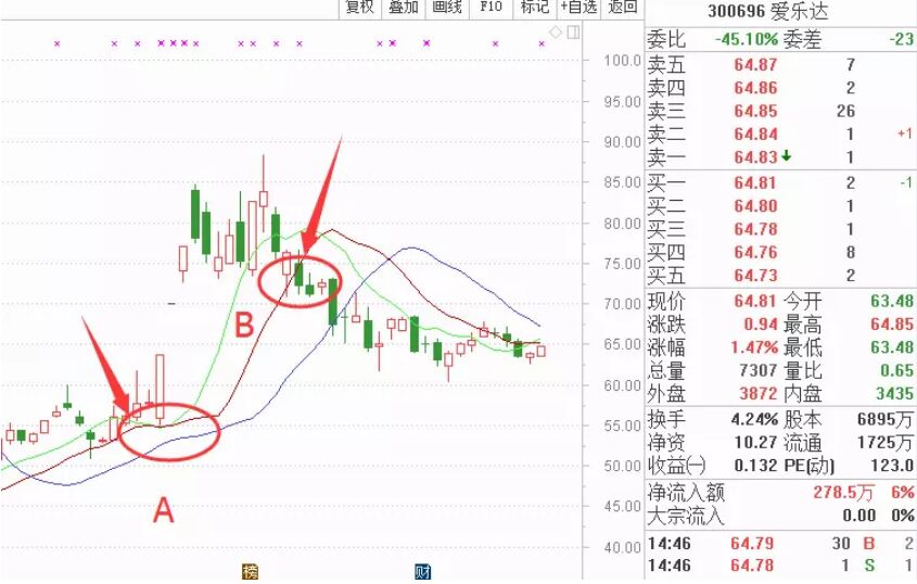 如上圖,我們可以看到A處可以清晰地看到鱷魚線三線向上打開,股價(jià)受到鱷魚唇線的支撐后形成上升趨勢(shì)。在B處股價(jià)跌破齒線,說明中線趨勢(shì)走壞,中線資金出局,隨后便是一波下跌走勢(shì)。