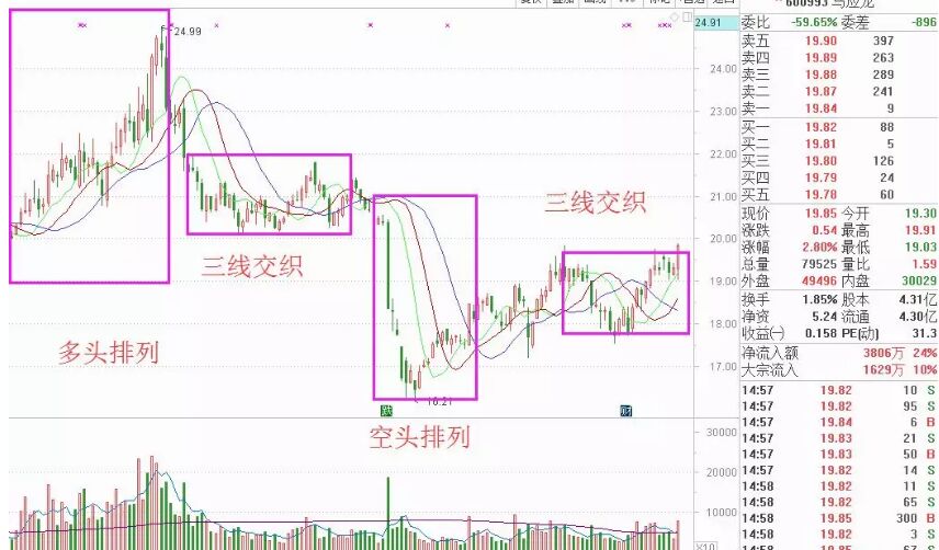 2、判斷市場(chǎng)多空。當(dāng)市場(chǎng)中多方力量占據(jù)優(yōu)時(shí),股價(jià)運(yùn)行在鱷魚線的上方;相反當(dāng)多方力量處于劣勢(shì)時(shí),股價(jià)就會(huì)在鱷魚線之下運(yùn)行。當(dāng)三條線交織在一起,并沒有清晰的排列順序表明股價(jià)是處于多空雙方爭(zhēng)奪的區(qū)域,股價(jià)的表現(xiàn)就是橫向窄幅波動(dòng),投資者應(yīng)當(dāng)謹(jǐn)慎的觀望,等到方向明確后再進(jìn)行買賣操作。如下面的馬應(yīng)龍走勢(shì)圖。